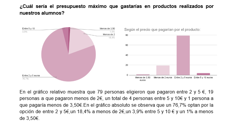 El poder adquisitivo respecto a los alumnos es bajo-medio, ya que nuestros clientes son jóvenes y adolescentes que no disponen generalmente de una economía propia. El rango de precio entre 2 y 5 euros en el cuestionario representa un 76.7% , esto quiere decir que el precio de nuestro producto final no es conveniente que supere los 5 euros.