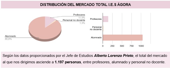 Hemos estudiado el mercado al que nos dirigimos, el cual según información del centro está compuesto por un total de 1182 personas incluyendo profesorado y alumnos de Secundaria, Bachillerato y Ciclos formativos.