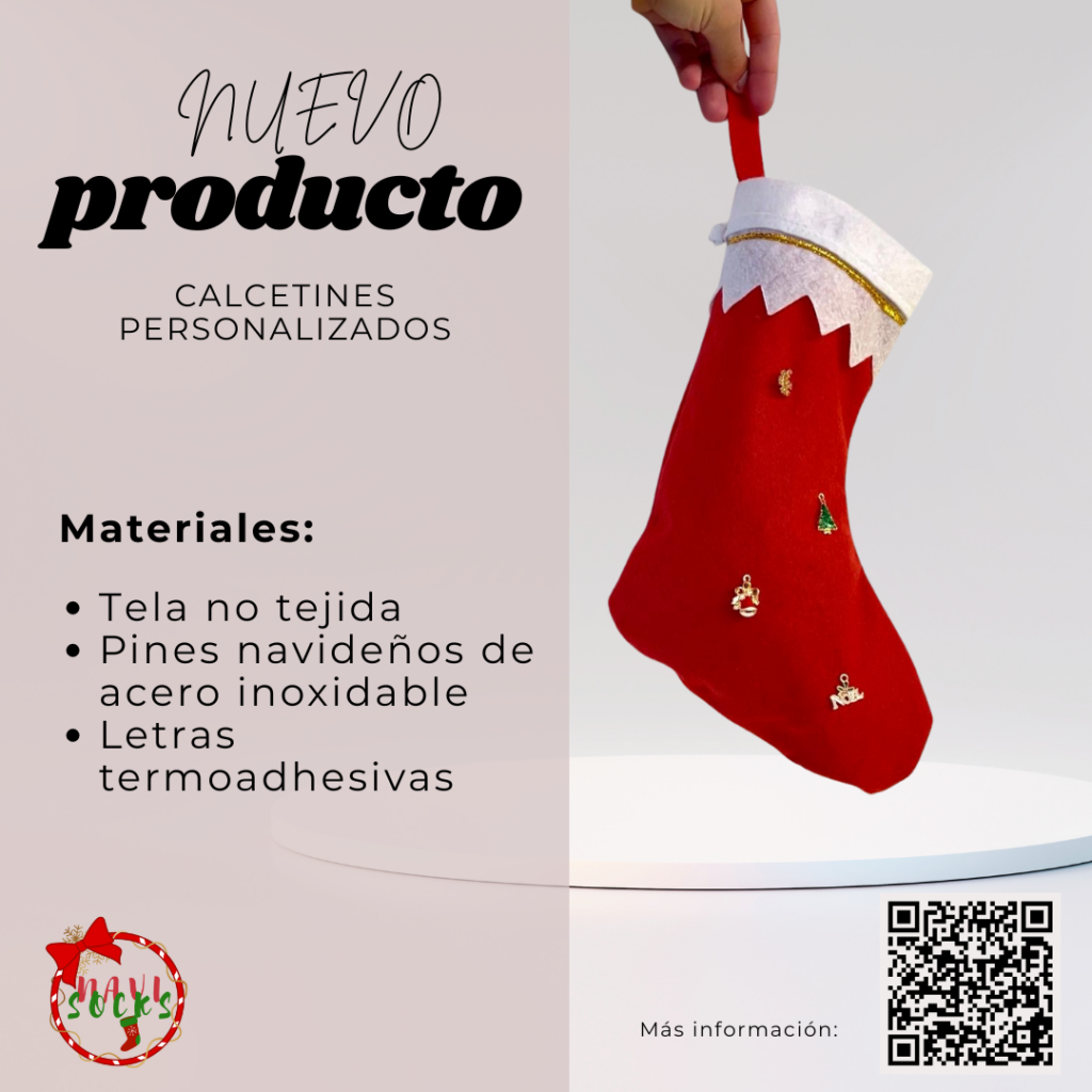 NaviSocks es una empresa dedicada a la venta de calcetines navideños personalizados, el estilo de calcetín que producimos son los típicos que se cuelgan en la chimenea, disponemos de tres modelos de calcetín; en el primer modelo se podrá poner el nombre al calcetín; en el segundo modelo se podrá poner pines navideños al calcetín y en el tercer modelo se podrá poner nombre y decorar con pines navideños.